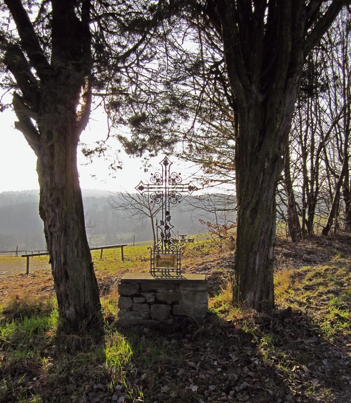 Schmiedeeisernes Wegekreuz auf Bruchsteinsockel aus dem beginnenden 20. Jhs. am westlichen Ortseingang, nahe der Einmündung des Altweges Weibspfad. Standort zwischen zwei angepflanzten Bäumen. Möglicherweise ersetzte des Kreuz ein älteres Flurdenkmal an derselben Stelle. Das Wegekreuz steht in der Tradition historischer Wegemarken im katholisch geprägten Gebiet, die insbesondere Altwege kennzeichnen.