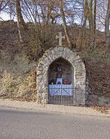 Gemauerte, spitzbogige Nische mit Kreuzbekrönung und schmiedeeisernem Schutzgitter in der Böschung der hier als Hohlweg tief ins Gelände eingeschnittenen Hauptstraße, die sich damit als Altweg darstellt. Möglicherweise ersetzte das um 1900 errichtete Gehäuse hier ein älteres Wegemal. Früher befand sich im Inneren eine Figur des hl. Josef, jetzt eine Madonnenfigur.