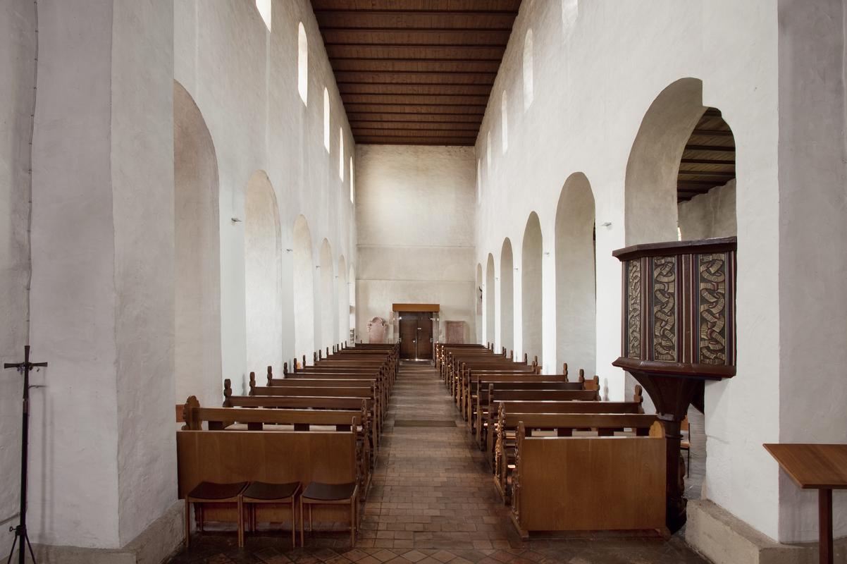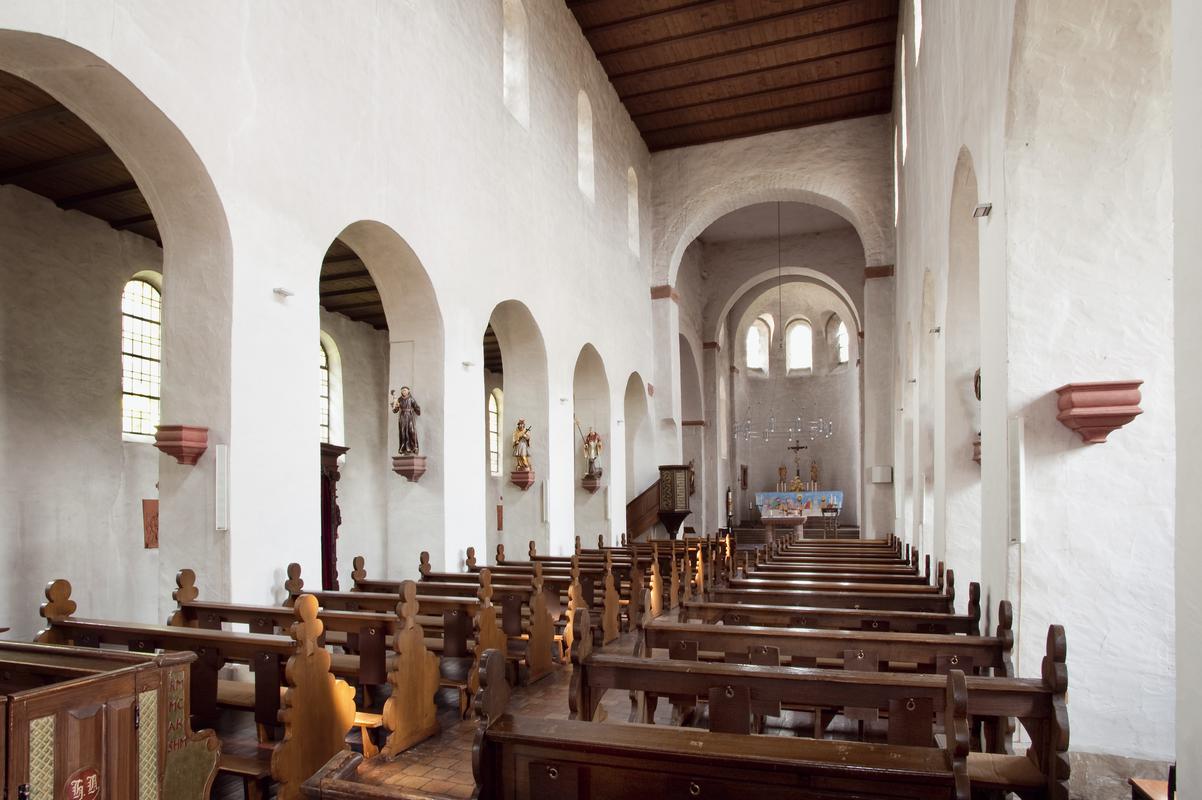 Innen flachgedecktes Langhaus von sechs Arkaden mit ausgeschiedener Vierung (hier Wölbungsansätze einer Gratwölbung). Das Querschiff war ursprünglich vom Langhausdach überdeckt; nördlicher und südlicher Vierungsbogen deshalb erheblich niedriger. Der Chor aus querrechteckigem Vorjoch und leicht eingezogener Halbkreisapsis ursprünglich niedriger und mit Wölbung im Vorjoch geplant; nach 1170 erhöht. Im Langhaus niedrige kämpferlose Rechteckpfeiler. Kreuzförmige Vierungspfeiler, vor allem hier und an den alten Apsisbögen teils profilierte Kämpfer, teils auch Schräge-Platte-Profil mit Ritzmustern. Bei der Renovierung 1938/52 wurden die Innenwände nur weiß geschlämmt, der romanische Sparrendachstuhl mit der Balkendecke entfernt und die nicht mehr vorhandene südliche Seitenapsis neu aufgebaut. Einige kleine monolithe Fenster wurden als Fundstücke neu eingesetzt.