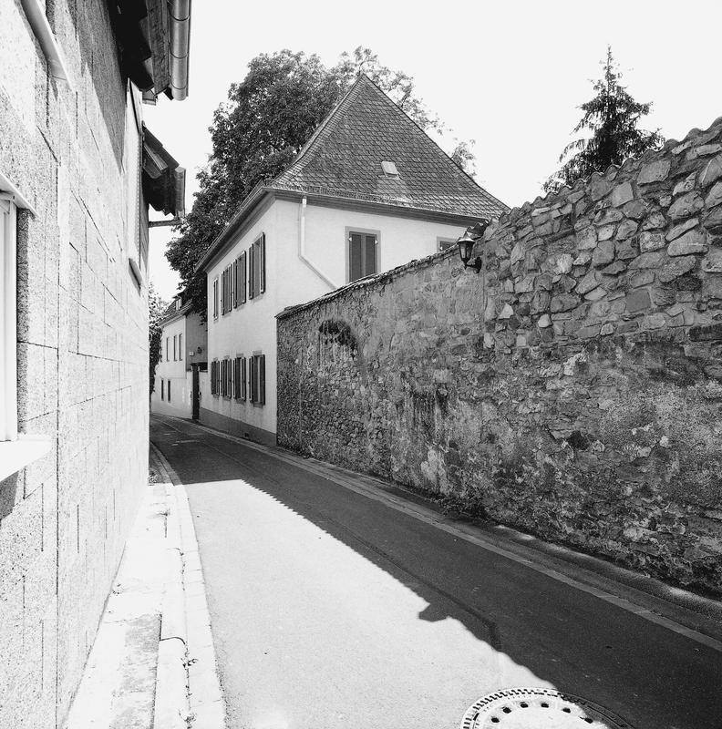 Traufständiges, massives Wohnhaus des 17./18. Jhs. mit steilem, hohem Walmdach. Schlichte Putzfassade, vier Achsen lang, mit einfachen rechteckigen Fensteröffnungen in Sandsteingewänden. Das zugehörige, weiträumige Grundstück wird von einer hohen Bruchsteinmauer begrenzt, die wie das in derselben Flucht liegende Gebäude das Straßenbild wesentlich bestimmt. Darin eine vermauerte rundbogige Einfahrt.