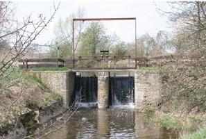 Von der historischen Bebauung ist deshalb nur wenig erhalten, einige Nebengebäude stammen noch aus dem 19. Jh. Im Wasserhaus findet sich noch ein hölzernes Mühlrad. Große historische und wirtschaftsgeschichtliche Bedeutung haben jedoch die Wehranlagen, die sich westlich und östlich des Anwesens erhalten haben und noch in Betrieb sind. Das westliche Wehr, das den südlichen Abschlag zum Ohlenbach reguliert, zeigt sich als bruchsteingemauerte Rückhaltemauer mit mittigem, gerundetem Pfeiler. Die darüber geführte Stahlbrücke trägt die Hebe- und Senkvorrichtung (Schotts) der beiden Durchlässe (Datierung 1940). Die Streichwehre, die den Hauptfluss der Gersprenz in den nördlichen und südlichen Abschlag teilen, sind inschriftlich auf 1839 und 1850 datiert. Östlich der Mühle wird eine weitere Verbindung zwischen Gersprenz und Ohlenbach durch ein Streichwehr aus Sandstein gebildet. Zum Denkmalumfang gehört auch die einbogige steinerne Brücke über den Ohlenbach, die mit polygonalem Bruchsteinmauerwerk verkleidet ist und Brüstungen aus Bruchsteinmauerwerk mit erhabenen Friesen auf Fahrbahnhöhe und als Handlauf aufweist. Die Wehre sowie die Brücke sind von wirtschafts- und technikgeschichtlicher Bedeutung. Die gesamte Anlage einschließlich der Wasserbauwerke ist aus geschichtlichen Gründen erhaltenswert.