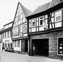 Hohes giebelständiges, zweigeschossiges Fachwerkhaus mit starkem Geschossüberstand über verputztem EG. Das Fachwerk der Fassade des 1. OG und des Giebels stammt aus der 2. Hälfte des 16. Jhs., worauf die Vorformen des Mannes und die S-förmigen Streben in den Brüstungsfeldern schließen lassen. Die Fenster wurden im 19. Jh. verändert. Der Hauseingang an der nördlichen Traufseite unter der Torüberbauung besitzt vielteilig gestäbtes, spitzbogiges, spätgotisches Gewände, datiert 1554. Erster Bau aus 1533, Umbau 1554 mit nach Norden gerückter neuer Traufwand. Im 16. Jh. als „Gasthaus zum güldenen Engel“ bekannt. In der Straßenfront der Fahrstraße hat der Bau eine dominierende Stellung, so dass neben den baukünstlerischen auch städtebauliche Gründe für seine Erhaltung sprechen.