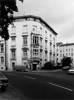 Mietshaus des Spätklassizismus von 1861 mit Eckfase und -erker, stuckiertem Fries und orig. Treppenhaus.
