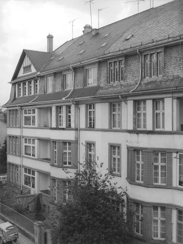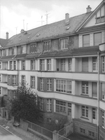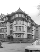 Mietshausgruppe des Neoklassizismus von 1912 nach Entwurf der Gebr. Heunisch mit bewegten Fronten durch Risalite und Ecktürme. Teil einer Baugruppe mit Franz-Lenbach-Straße 2.