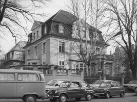 Neoklassizistische Villa von 1908 nach Entwurf von W . Grünewald mit axialem Balkonerker und reliefiertem Zwerchhausgiebel; orig. Balkongitter.