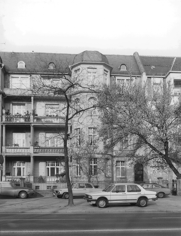 Doppelmietshaus in vorwiegend neoklassizistischen Formen von 1913 nach Entwurf von W. Behrens mit zentralen Säulenbalkons und polygonalen, turmartigen Erkern; orig. Balkongitter sowie Einfriedung.