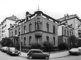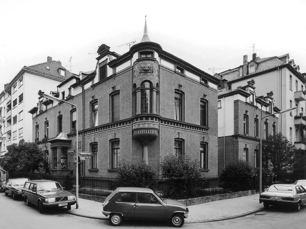 Wie Böhmerstraße 62/64 Doppelwohnhaus in Anlehnung an Formen des Spätklassizismus von 1882 nach Entwurf von S. Ravenstein mit Verblendmauerwerk und axialem Ziergiebel an jeder Doppelhaushälfte, jedoch zusätzlich mit prägnantem Runderker.