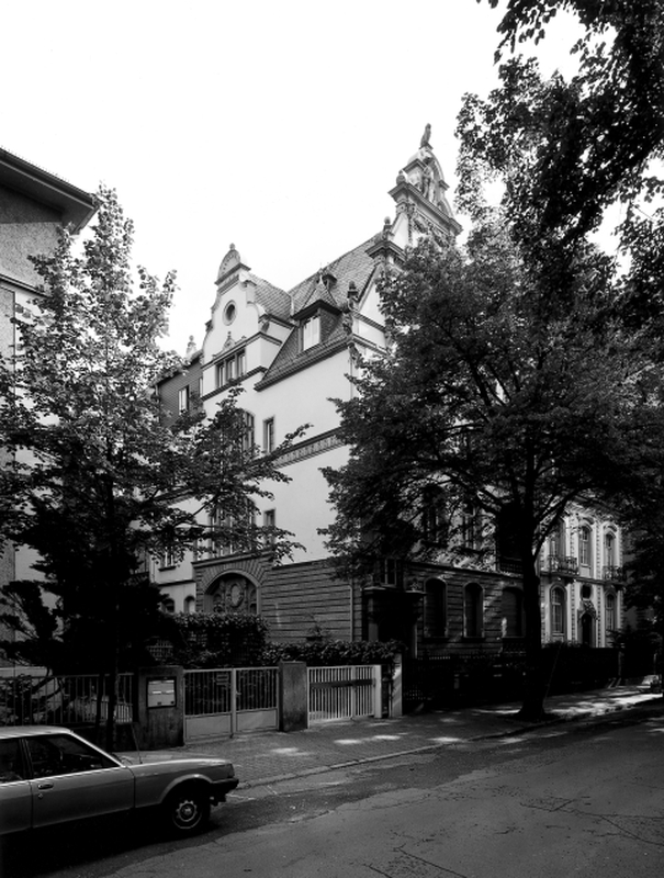 Aufwendiges Mietshaus der Neurenaissance von 1894 mit reichem Sandsteindekor an Portal und Giebeln, orig. Eingangstüren sowie urspr. Einfriedung.