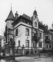 Wohnhaus von 1886 nach Entwurf von L. Neher & A. v. Kauffmann in renaissancistischen Formen; Portal durch Axialrisalit unter Giebel betont.