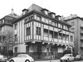 Wohnhaus von 1909 nach Entwurf von O. Fucker mit moderner Vertikalgliederung unter ehem. steilem Walmdach und auskragender Loggia zwischen Eckerkern.