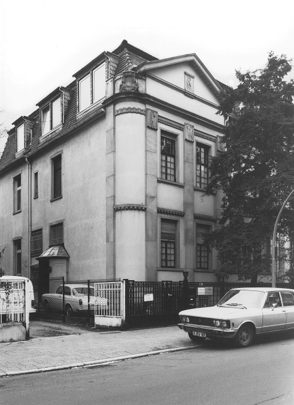Doppelmietshaus, 1910 errichtet von Johann Andreas Ravenstein mit reliefierten Schmuckelementen über Pilastergliederung und ursprünglicher Einfriedung.