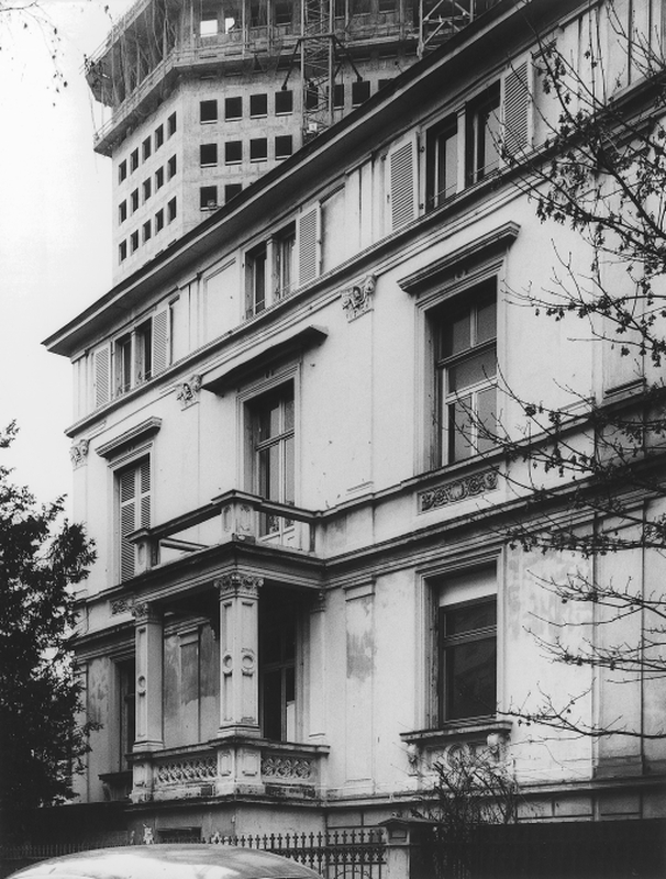 Spätklassizistisches Doppelhaus von 1863 mit Pilastergliederung und zentralem Altan; im Innern stark verändert, urspr. Einfriedung.