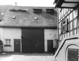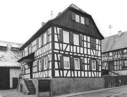 Barocke, fränkische Hofreite des 17. Jh. aus Facherkhaus mit hoher Treppe und Scheune.