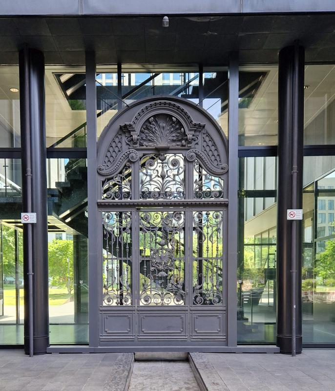 In das Gebäude ist ein schmiedeeisernes Schmuckportal aus dem Jahr 1891 integriert, das ursprünglich den repräsentativen Haupteingang der kriegszerstörten Zentrale der Frankfurter Bank in der Neue Mainzer Straße 80 zierte.