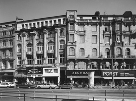 Geschäftshäuser des Neoklassizismus von 1904 nach Entwurf von J. Rindsfüßer & M. Kühn. Steinfassade mit Kolossalsäulen, noblem Dekor, orig. Balkongittern.