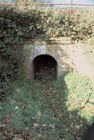 Tonnengewölbter Dammdurchlass von 1848 aus Bundsandstein mit Böschungsflügeln für einen Wassergraben westwärts zur Nidda.