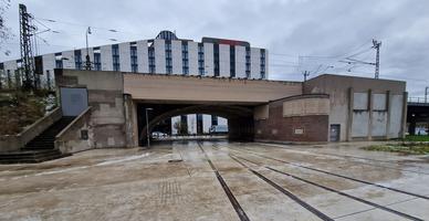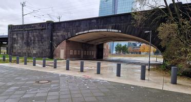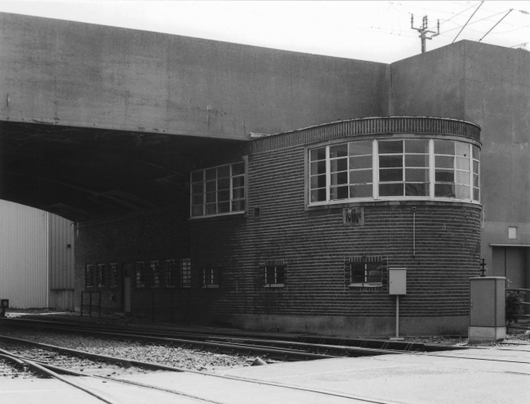 Unter die Basaltbrücke von 1912-13 geschobener Klinkerbau von 1928 in Formen des Neuen Bauens mit gerundetem Schaltraum auf der Westseite zur Fahrkoordination der sich südwärts der Großmarkthalle/Europäische Zentralbank verzweigenden ehemaligen Hafenbahn.