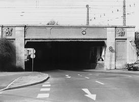 Betonbrücke von 1917 mit seitlichen Zwillingspilastern und steinernen Reiterreliefs zuseiten gefelderter Brüstungen über die Liederbacher Straße.
