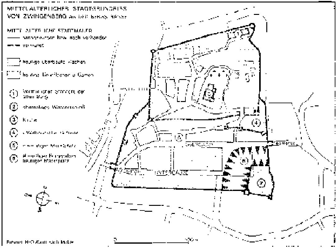 Erhaltene Teilstücke der alten Stadtmauer, die Zwingenberg spätestens seit der Verleihung der Stadtrechte unter Graf Diether V. von Katzenelnbogen im Jahr 1274 umschloss. Möglicherweise war die alte Oberstadt auf dem Berg schon etwas früher durch eine annähernd quadratische Umfassungsmauer mit runden Ecktürmen gesichert, wobei deren am stärksten gefährdete Südfront zusätzlich durch eine Burg in der Südostecke und eine Bastion auf dem Gelände der sogenannten Kaserne und des ehem. Walbrunner Hofes befestigt worden sein könnte. Dafür gibt es jedoch keine gesicherten Erkenntnisse. Westlich wurde die mächtige Stützmauer zur Sicherung des Hanges erbaut.