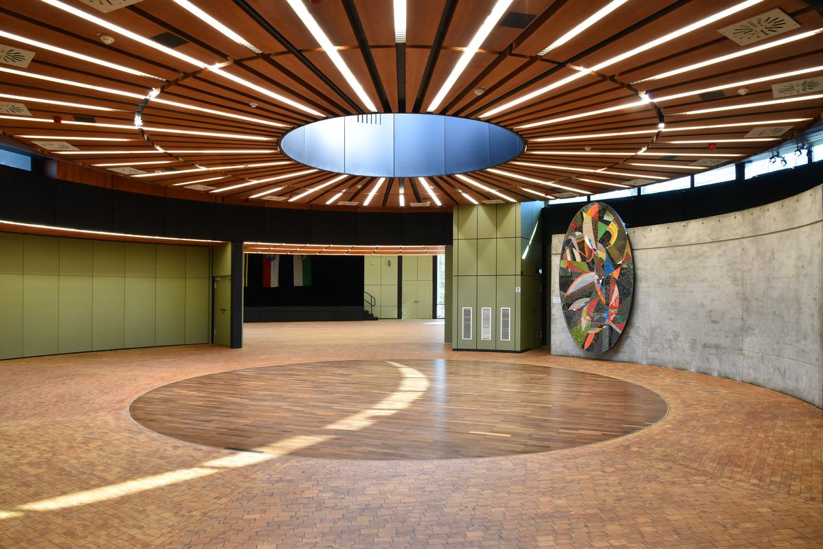 Die Stadthalle mit der dazu gehörigen Außengestaltung ist Kulturdenkmal.