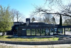 Das 1971/72 ausgeführte Gebäude ist ein Stahlskelettbau, dessen äußere Unterzugsringe über radial angeordnete Binder mit den inneren Unterzugsringen verspannt sind. Die Raumhöhen variieren entsprechend der Größe und Nutzung der Räume. Die Außenverkleidung, Fenster, Türen und Einbauten bestehen aus dunkelbraun eloxierten Metallelementen, die neben dem Glas und den silberfarbigen Jalousien das Erscheinungsbild des Baukörpers bestimmen. "In dem vielfach aufgefächerten, flachen Zylinder ist die Vorstellung von einem Bau realisiert, dessen Aussehen eins ist mit der Aufgabe, die er zu erfüllen hat, und dem Ort, an dem er steht.“ (B. und E. Kimmel)