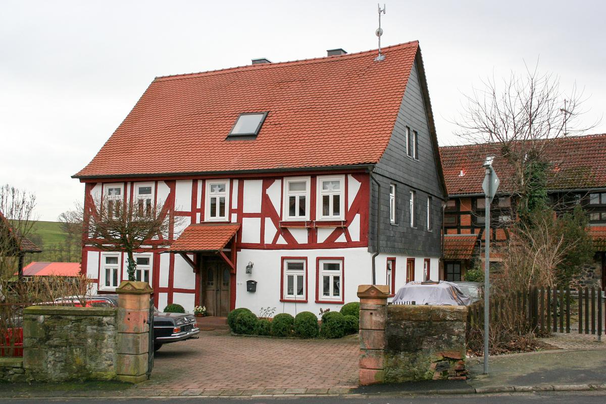 Zweigeschossiges Fachwerkwohnhaus, teilweise verputzt und giebelseitig verschindelt. Fachwerk in starken Dimensionen wie den breiten Eckständern sowie Eckstreben mit Gegenstreben. Zur Straße hin die ursprüngliche Torsituation durch zwei Sandsteinpfosten und Resten der Ummauerung erhalten.