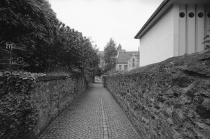 Zu beiden Seiten der Pfaffengasse befinden sich noch immer Bruchsteineinfriedungen, die die ehemals unbebauten Gartengrundstücke auf dem Besitz des Stiftes und später des Dalbergschen Fonds zum Straßenraum abgrenzen.