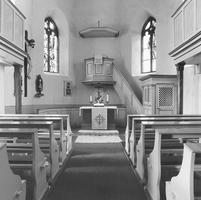 Einschiffiger Bau mit dreiseitigem Chorschluß. Fassade mit eigenartigem, hier sonst nur bei Rathäusern vorkommenden Staffelgiebel und Dachreiter. Erbaut 1485. Der Bau prägt das Bild des Ortes entscheidend. Das Maßwerk 1929 rekonstruiert.