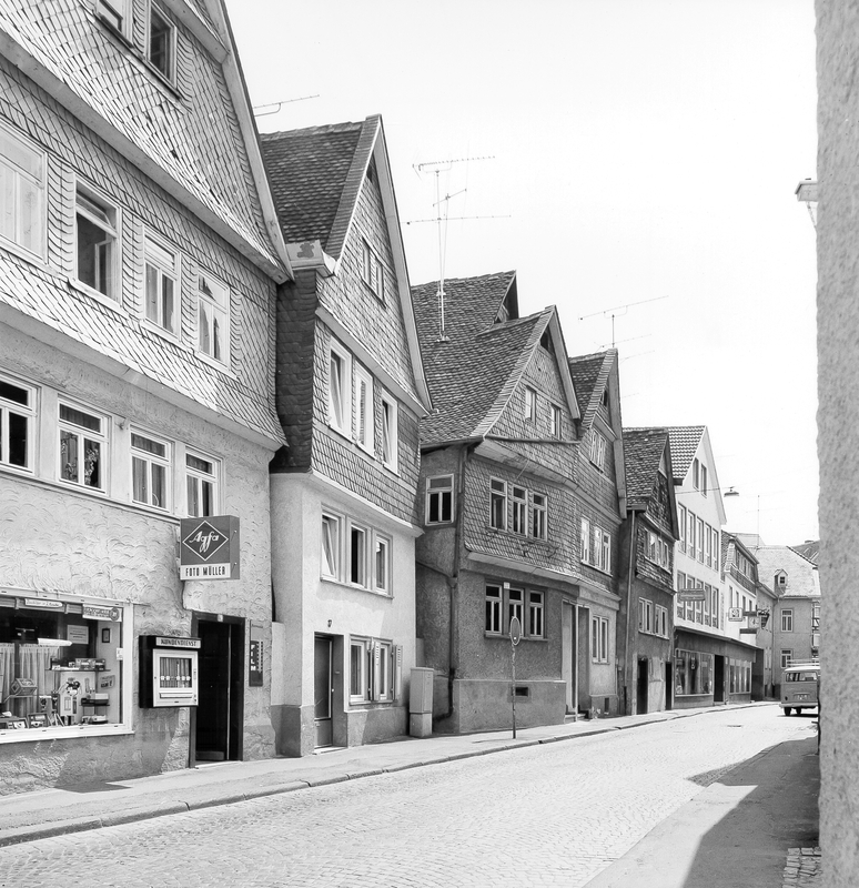 Wichtiger Bestandteil des Straßenbildes. Gleicher früher Bautyp mit Halle im Erdgeschoß, darüber alte Dreierfenstergruppe, das Hallengeschoß besitzt offenbar noch das ursprüngliche Schmuckfachwerk. Darüber verschiefertes Obergeschoß. Entstanden im 17. Jh.