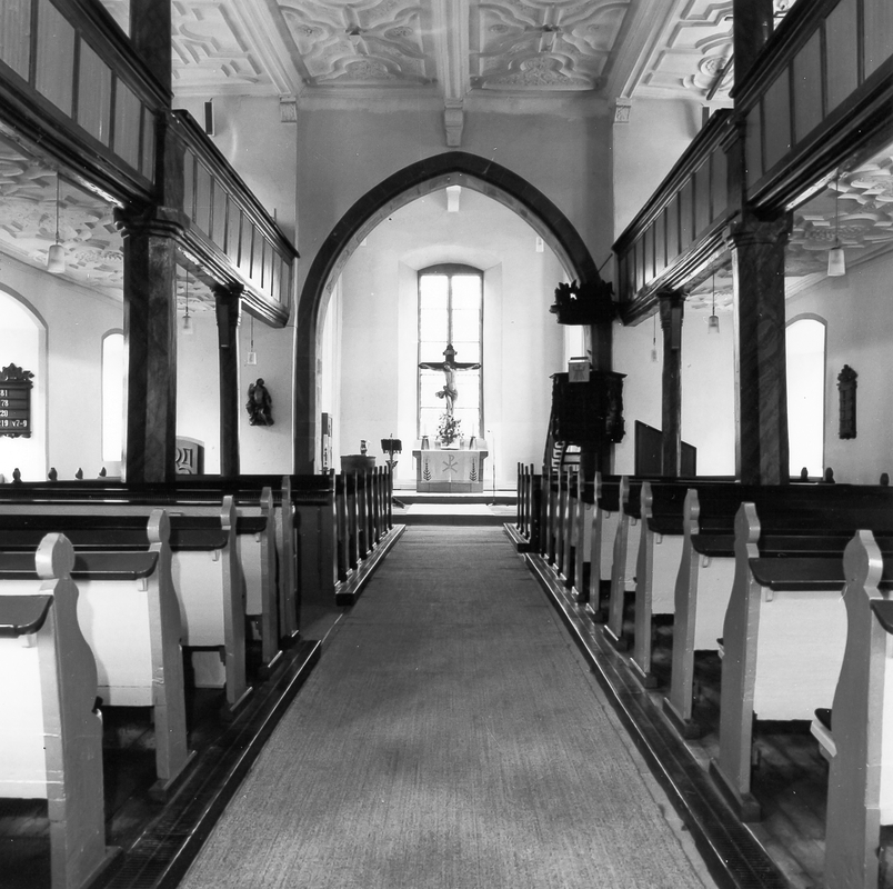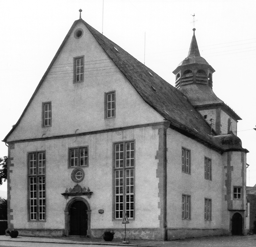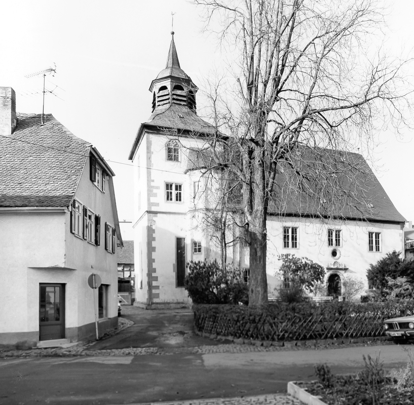 1616-18 auf einem von Landgraf Ludwig geschenkten Grundstück erbaut durch den "fürstlichen Baumeister und Mainzer Werkmeister", vermutlich Jakob Wustmann. Breitgelagerter Saalbau mit südlichem Chorturm und seitlichen Treppentürmen. Steiles Satteldach, hohe, beide Geschosse überspannende Fenster an der Fassade. Durch das Äußere bewußt den Eindruck eines Profanbaues hervorgerufen. Im Innern durchgehende Holzstützen, die die Decke und die Emporen tragen. Die Flachdecke mit drei Längsunterzügen und die Untersichten der Emporen hervorragend stukkiert - geometrisierend in Medaillons und Vierpässen mit Wappen des Landesherren und seiner Gemahlin (Ludwig V. von Hessen-Darmstadt und Magdalena von Brandenburg) und Darstellung von Doppeladler, Phönix und Pelikan, Datum 1616. Gute Kanzel von 1616, Orgel 2. Hälfte 18. Jhs., Taufstein um 1618. Türen des 17. Jhs. Bedeutender Gründerbau des protestantischen Kirchenbaus in Hessen. Wichtiger Ansatz, einen eigenen Kirchentyp aus der Tradition der Schloßkapelle entgegen der spätmittelalterlichen Bautradition zu entwickeln.