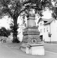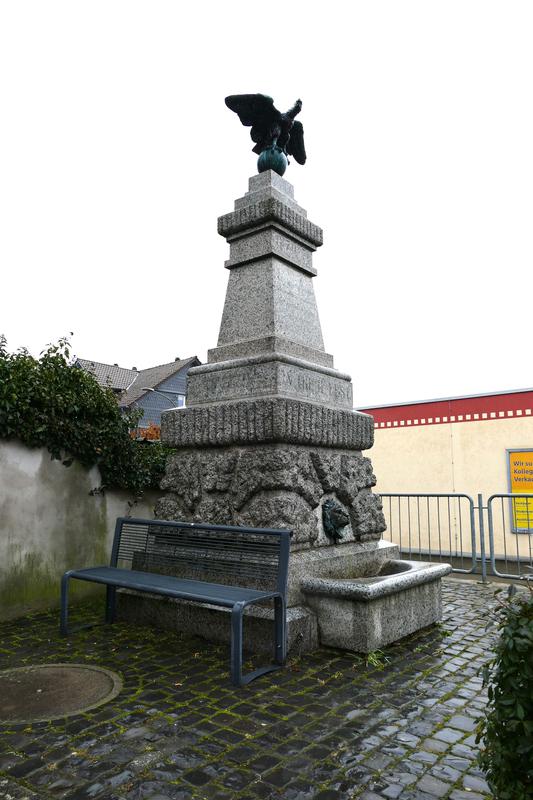 Denkmal für die Gefallenen des Krieges 1870/71 aus grauem Granit mit Inschrift "In Treue fest". Löwenkopf als Wasserspeier in Bronze und bronzener Adler auf Weltkugel.