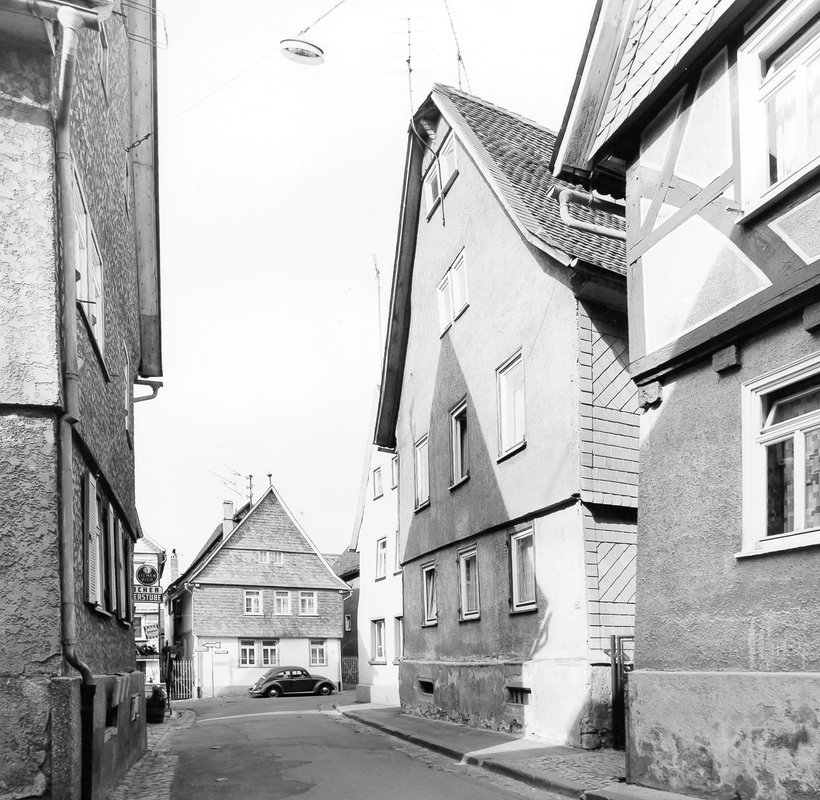 Benachbart dem frühen Bau Schloßgasse 11 in ähnlichen Proportionen, die Giebelfassade verputzt, die Traufseite mit Übersetzungen asbestzementverschindelt. Im obersten Giebel der Krüppelwalm von gedrehter Konsole getragen. Die ursprüngliche Fenstereinteilung ist vorhanden. Anhand der Proportionen und des winzigen Krüppelwalms im Erdgeschoß ist der Bau in das frühe 17. Jh. einzuordnen.