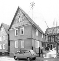 Hakenförmige Hofreite als städtebaulicher Abschluß der Weiherstraße. Das Scheunengebäude des 19. Jhs. teilweise umgebaut und gestört. Das Wohnhaus in Fachwerk, unter Putz liegend, giebelständig zur Straße mit übersetztem Geschoß. Der Giebel verschiefert. An der Traufseite im Reul sehr interessantes frühes Fachwerk noch des 17. Jhs. Starkes Karnies mit Hohlkehle.