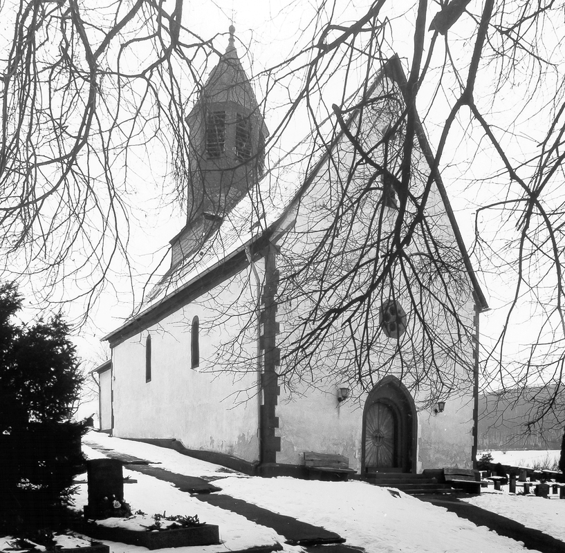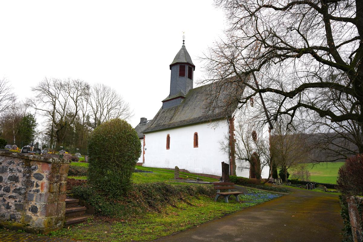 Außerhalb des Ortes auf einer Anhöhe gelegen. Kleiner, spätromanischer Saalbau mit krabbenbesetztem Westportal. An der Langschiffswand zwei konisch abgefaste Rundbogenfenster, 13. Jh. Der Chor 1. Hälfte 13. Jh. An der Südwand die romanischen Fenster aufgegeben zu Gunsten barocker Öffnungen, Dachreiter 17. Jh. Der Wehrkirchencharakter wird unterstrichen durch die z. T. erhaltene Ummauerung des Kirchhofs.