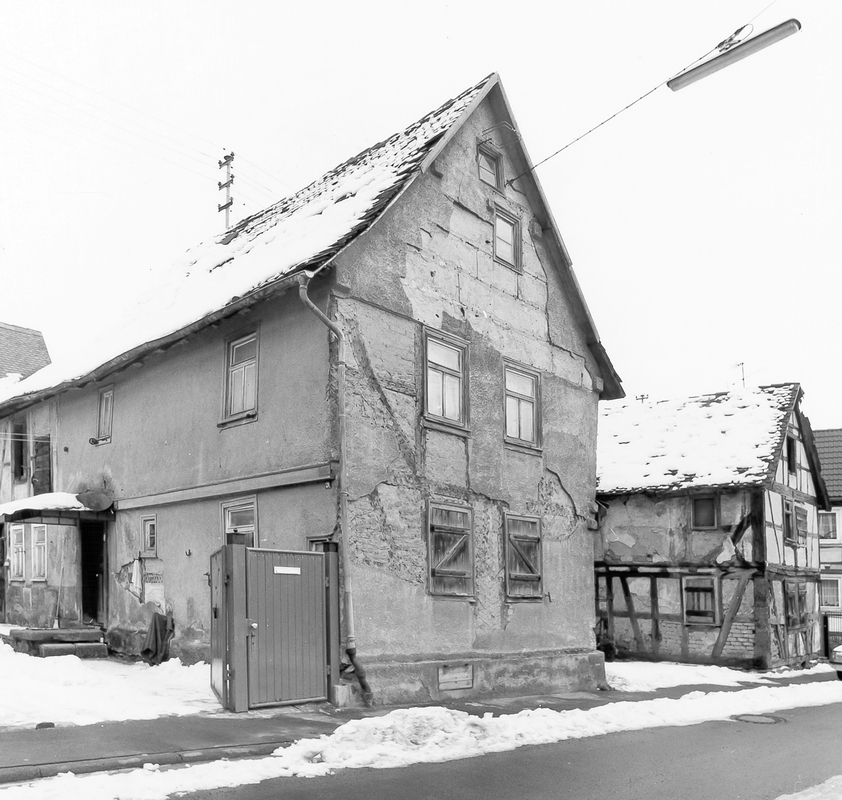 U-förmige Hofreite mit verputztem Fachwerkwohnhaus, giebelständig zur Straße. Beiderseitig Geschoßüberstände. Unter abfallendem Putz Fachwerk des frühen 18. Jhs. erkennbar. Gut proportionierter, ungestörter Bau, jedoch in schlechtem Zustand. Im hinteren Bereich Scheunengebäude, ebenfalls desolat.