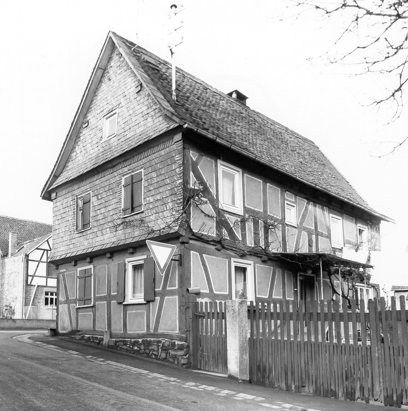 Fachwerkwohnhaus, traufständig zur Straße. Zweigeschossig mit starker Übersetzung, urwüchsig gebogenen Eckstreben, Wilder Mann-Form im Giebel, geschuppten Eckständern mit Radsymbol, doppelt profilierter Schwelle. Kurze, in den Brustriegel eingezapfte Pfosten mit Radornamentik und Kreissymbolen. Frühes 17. Jh. Nach einer früheren Inschrift angeblich 1618 erbaut.