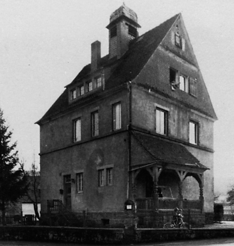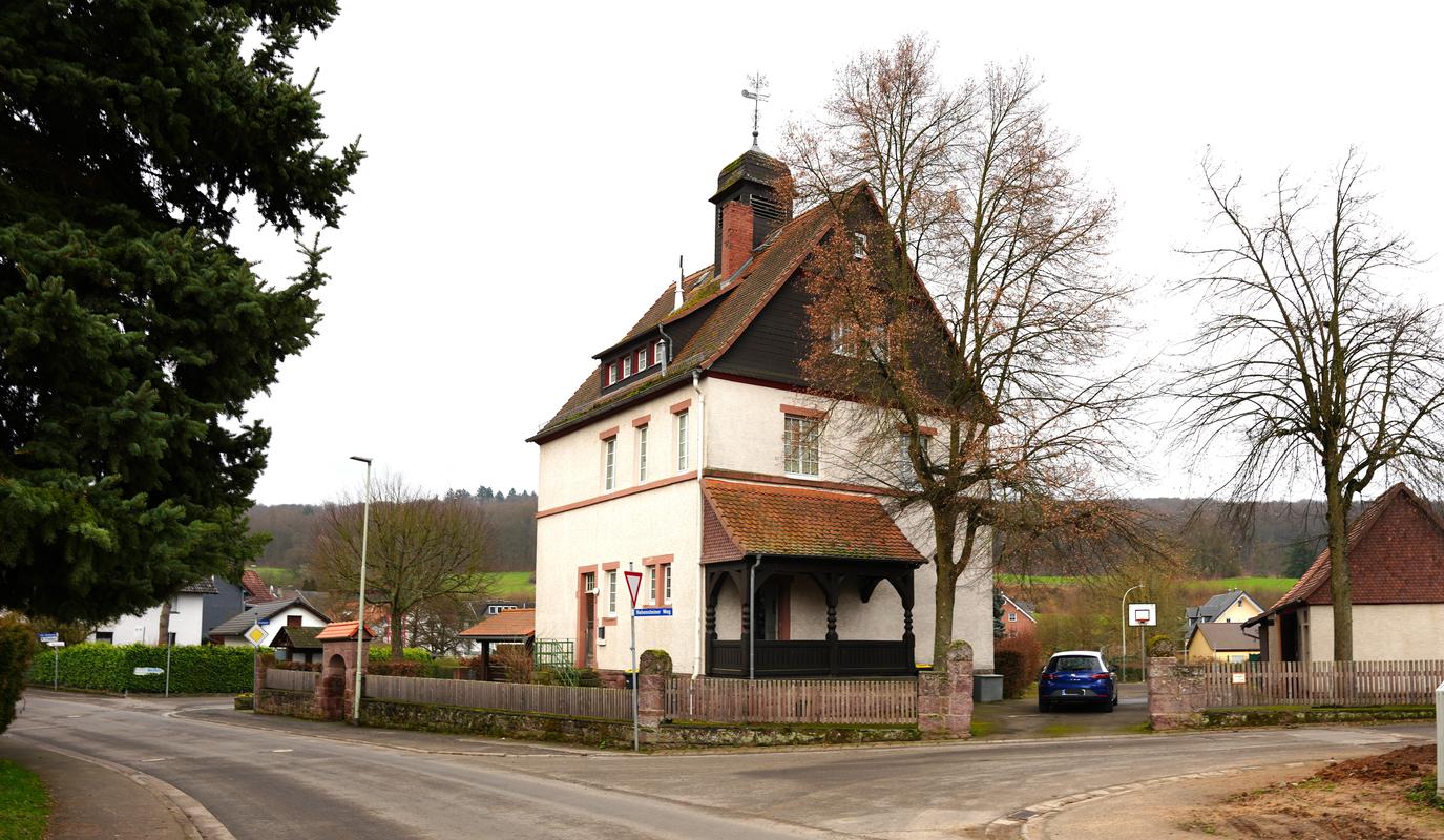 Schulgebäude in städtebaulich beherrschender Lage mit Tuffsteinummauerung, historisierend mit überdachtem Eingang auf Holzstützen, Giebel verschindelt, umlaufende Sandsteingesimse. Toilettengebäude, versetzt zum Schulgebäude, im gleichen Stil, ebenfalls holzverschindelt. Überdachter Tordurchgang, schmiedeeiserne Geländer. Wetterfahne mit Datum 1905.