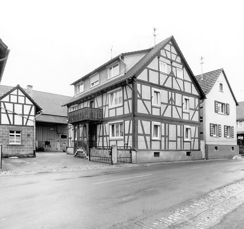 Großvolumiger Fachwerkwohnbau in prominenter Lage am Ortseingang. Im Hintergrund, L-förmig angeordnet Stall- und Scheunengebäude. Das Wohnhaus in einfachen, spätbarocken Formen mit umlaufendem Karnies. Spätes Vorkommen des Wilden Mannes, entstanden um 1800.
