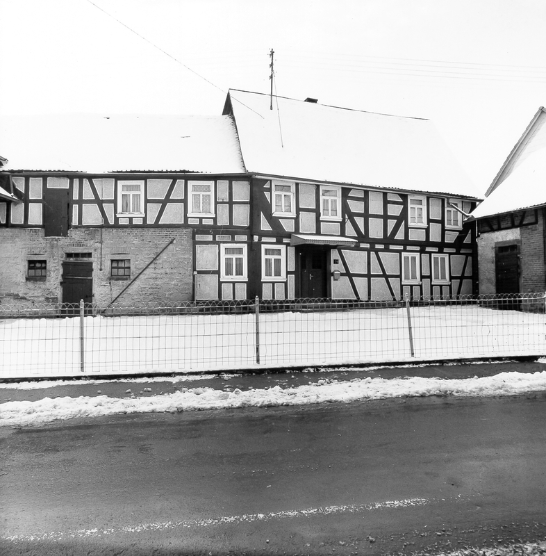 Von der Straße zurückgesetzter, offener Hof, die Stall- und Wirtschaftsgebäude neueren Datums. Das Wohnhaus traufständig parallel zur Straße, zweigeschossig, das Untergeschoß im 19. Jh. erneuert. Im Obergeschoß starkes, reiches Fachwerk aus der 2. Hälfte des 17. Jhs. Überbreite Streben mit Kopfbändern, Tauornamentik. Klotzartige Balkenköpfe, Brustriegel durchbrochen. Frühester Bau am Ort.