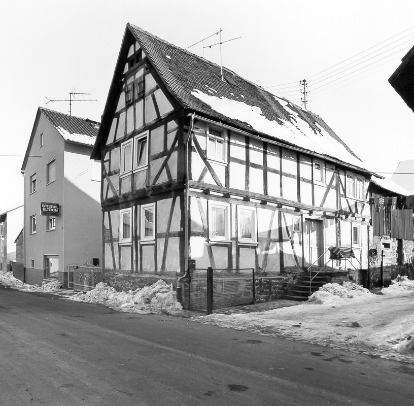 Gut erhaltenes, typisches Wetterauer Fachwerkwohnhaus aus der 1. Hälfte des 18. Jhs; in allen Details erhalten. Freitreppe, Ornamentik im Giebeldreieck mit Taubenschlag, verschalte Balkenlage, geschweifte Streben, im Erdgeschoß erneuert. Scharfes Karnies, umlaufend. Tür frühes 19. Jh. Stall- und Wirtschaftsgebäude uninteressant.