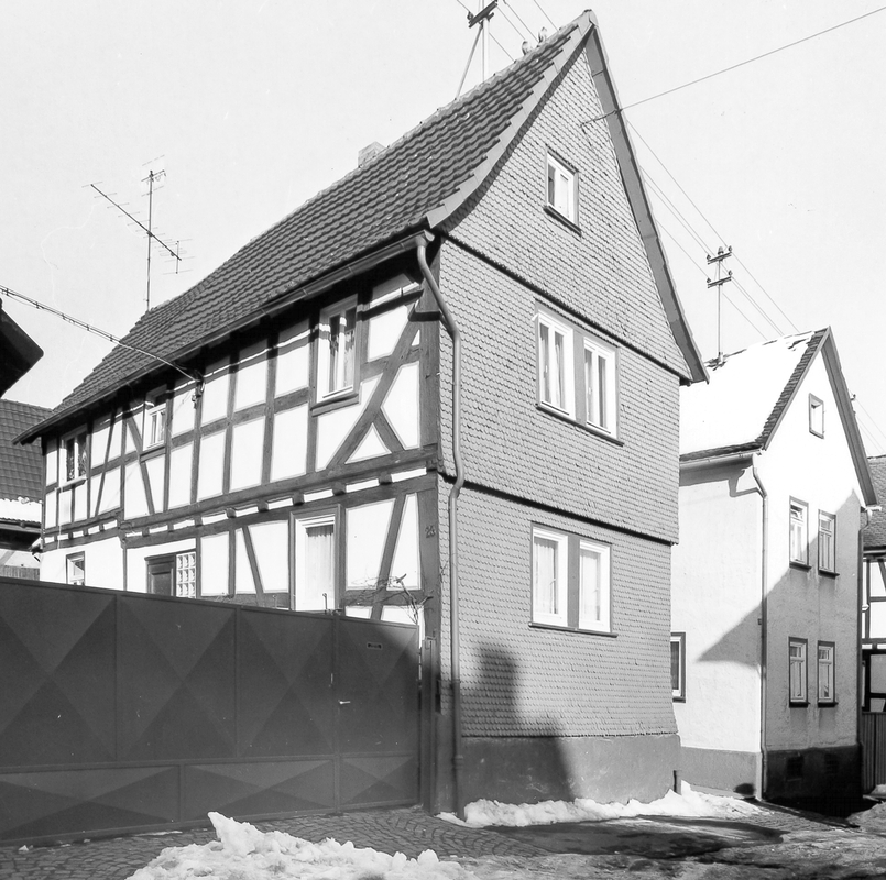Gute Hofreite des späten 17. Jhs. mit Scheune aus der gleichen Zeit. Das Fachwerk des Wohnhauses z. T. holzverschindelt. Weit ausladende Streben, relativ einfaches Fachwerk, jedoch innerhalb der sich hier kumulierenden guten barocken Fachwerkhäuser ein ausgewogenes Beispiel.