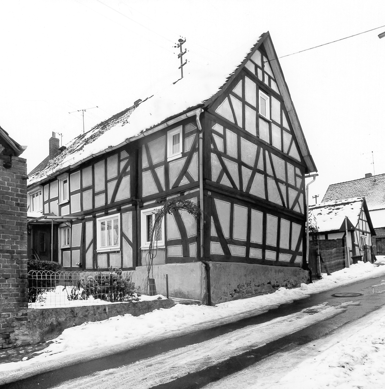 Stark in den Straßenraum wirkender Mühlenarbeiter-Doppelhof mit Teilung in der Querrichtung. Gutes Fachwerk aus der Zeit um 1700, profilierte Schwellen usw. Wichtig gegenüber der Bruchsteinmauer, in der die Felsenkeller liegen.
