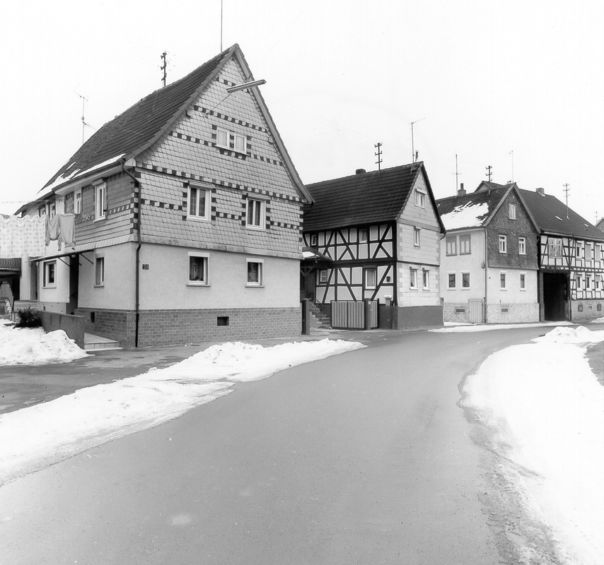 Gut proportioniertes Fachwerkgebäude über massivem modernen Sockelgeschoß. Wichtiger Blickpunkt. Im Obergeschoß alte Asbestzementverschieferung mit ungestörten Fensteröffnungen. An Hand der Proportionen gutes Fachwerk noch des 17. Jhs. zu erwarten.