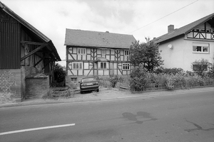 Leicht von der Straße zurück versetztes traufenständiges Fachwerkhaus aus der Zeit um 1800. Das zweistöckige dreizonige Gebäude steht auf einem mittelhohen Sandsteinsockel und zeigt ein regelmäßiges ausgewogenes Fachwerkgefüge mit Mannfiguren an Bund- und Eckständern sowie doppelte Verriegelung. Im Obergeschoss werden die Bundständer durch Fischgrät - Fachwerk und flankierende Vertikalstreben charakterisiert. Die Gebälkzone ist profiliert. Dem ehemaligen Wohnwirtschaftshaus mit integriertem Stall im Keller wurde später ein Eingangsvorbau in angepasstem Fachwerk vorgesetzt.