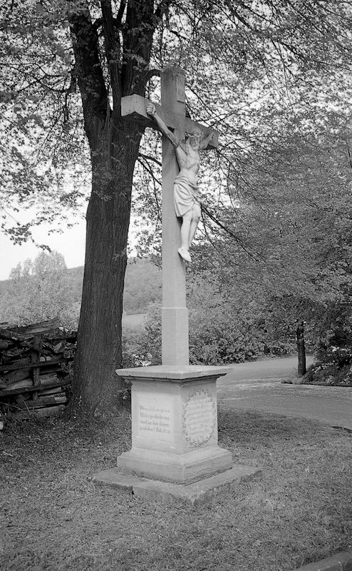 Am nördlichen Ortsrand an einer Straßengabelung stehendes Steinkruzifix, bezeichnet 1867. Das tischartige Postament zeigt auf seiner Vorderseite einen in Flachrelief gearbeiteten Blattkranz, in dem ein Anbetungstext steht. Auf den Seiten finden sich biblische Inschriften. Die Rückseite nennt die Stifter Joseph Hahner und dessen Ehefrau Maria Theresia geb. Hornfeck aus Haselstein und die Jahreszahl 1867. Der schlichte abgesetzte, aus rotem Sandstein gefertigte Kreuzstamm trägt einen differenziert durchgebildeten Korpus aus hellem Sandstein.