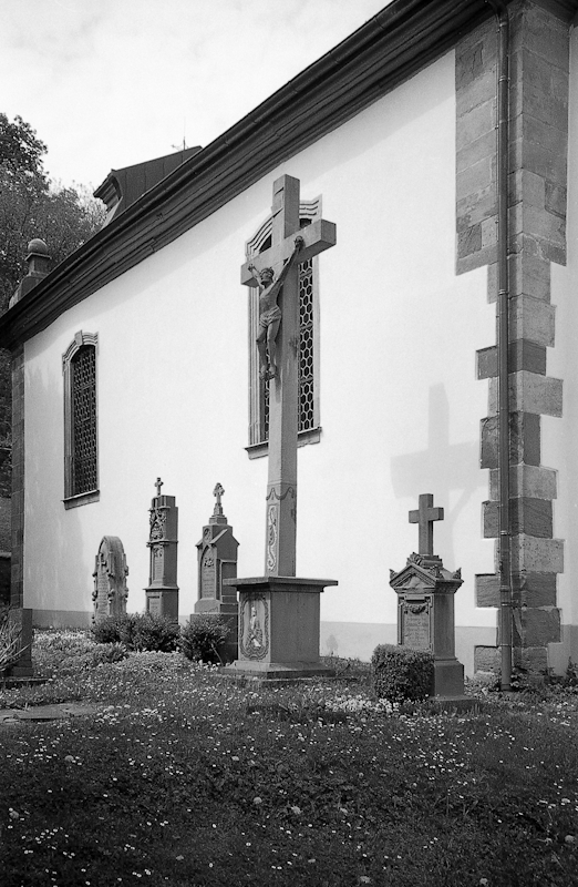 Vor der südlichen Längswand der Kirche platziertes Steinkruzifix von 1844. Das Postament zeigt auf der Vorderseite in einem Rahmen aus stilisierten Blättern ein Flachrelief der Schmerzensmutter. Auf der Rückseite findet sich die Inschrift: "DIESES KREUZ WURDE ALS LETZTE WILLENSERFÜLLUNG DES VERLEBTEN FRIEDRICH THOMAS ZUR ERINNERUNG AN IHN UND SEINE FAMILIE, ERRICHTET VON IOSEPH KAUFHOLZ U. DESSEN EHEFR. MARIA GEB. RUPPEL IM JAHRE 1844". Der abgesetzte, sich nach oben verjüngende Kreuzstamm ist im unteren Teil mit einer stilisierten Girlande und floralen Motiven in einem schlichten Rahmen geschmückt. Der für die Maße des Kreuzes etwas zu kleine Korpus des Gekreuzigten ist eine schlichte, aber sorgfältige Arbeit. Als beredtes Zeugnis privater Frömmigkeit aus der Mitte des 19. Jahrhunderts ist das Friedhofskreuz von Haselstein aus ortshistorischen und künstlerischen Gründen erhaltenswert.