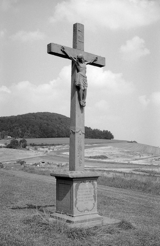 Neben der Kapelle der Vierzehn Nothelfer stehendes Steinkruzifix, bezeichnet 1841. Auf der Vorderseite des Postamentes findet sich in einem aus floralen Motiven gebildeten Flachreliefrahmen die Inschrift: "HERR IESUS, MEIN TROST UND MEINE ZUVERSICHT IN DEINE HAENDE EMPFEHLE ICH MEINEN GEIST!". Auf den Seiten sind in taustrickartigen Rahmen weitere Inschriften zu lesen. Auf der Rückseite werden schließlich Stifter und Künstler genannt: "DIESES ZEICHEN DES HEILS ERRICHTETE DER EHRSAME WITWER RHABAN HOHMANN A. MORLES UNTER DEM H. H. PFARRER MODENBACH ANO 1841 DURCH...STEHLING Z. HASEL". Auf der Oberseite der Abschlussplatte des Postaments ist in Flachrelief die Paradiesschlange dargestellt. Das kräftige, sich leicht verjüngende Steinkreuz zeigt im unteren Bereich unter einer Girlande ein hochrechteckiges, von einem Taustrick gerahmtes Zierfeld mit floralen Motiven. Das qualitätvolle Kruzifix mit der gut durchgebildeten Figur Christi ist eine weitere Arbeit des Bildhauers und Steinmetzen Franz Stehling aus Kirchhasel, der in den ersten Jahrzehnten des 19. Jahrhunderts eine Reihe religiöser Bildwerke im Kreisgebiet schuf. In Hofaschenbach selbst stammt von ihm noch die Kreuzigungsgruppe am Ortsausgang nach Morles.