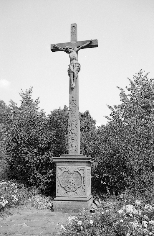 An der Abzweigung der Bachstraße von der Haselsteiner Straße stehendes Steinkruzifix, bezeichnet 1852. Das reich gestaltete, qualitätvolle Wegekreuz hat ein kräftiges Postament, auf dessen Vorderseite eine aus Rocaille - Ornamenten gebildete Kartusche mit einem Vesperbild in Flachrelief zu sehen ist. Um das Relief befindet sich die Inschrift "Maria! Keusche Himels Rose, Bitt für uns arme Sünder all Damit dein Sohn auf deinem Schoose Uns führ aus diesem Jamer Thal!". Auf den übrigen Seiten des Kubus sind in schlichten Rechteckrahmen weitere Inschriften zu lesen. Der kräftige, sich verjüngende Kreuzstamm zeigt auf der Vorderseite unten ein Flachrelief des Heiligen Laurentius mit Unterschrift; darüber ist der Stamm mit Rocaille - Ornamenten, Atributen und den Leidenswerkzeugen gestaltet. An den Seiten des Stammes finden sich florale Ornamente. Die schlanke, expressiv gedrehte Skulptur Christi mit dem stark nach rechts geneigten Haupt ist eine gute Steinmetzarbeit.