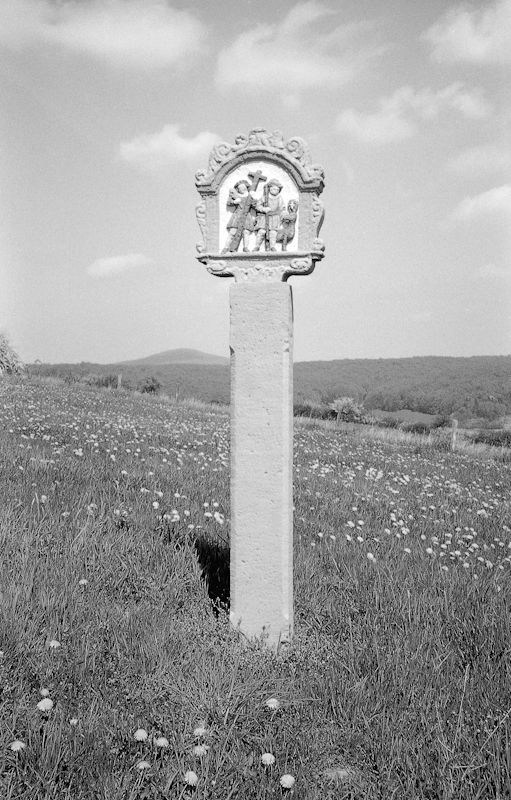 In leichter Hanglage am Fußweg zum Gehilfersberg stehender Bildstock, der im Kern vermutlich um 1750 erstellt wurde. Der etwas zu wuchtige erneuerte Pfosten trägt den segmentbogig abgeschlossenen Aufsatz auf Volutenbasis, dessen Flanken und Oberseite mit Blattwerk und Voluten verziert sind. Das Relief auf der Vorderseite zeigt den hl. Achatius mit großem Kreuz, Dornenkrone und Dornenzweig, neben dem der hl. Euchatius durch eine Lanze und einen Hirsch mit Kreuz im Geweih gekennzeichnet ist. Auf der Rückseite findet sich die Inschrift "In cruce dura pati pugiles facis Achati Eustachiusque cluit tostus in aere fuit". Als fünfter Bildstock begleitet er den Wallfahrer auf seinem Weg zur Kapelle auf dem Gehilfersberg.