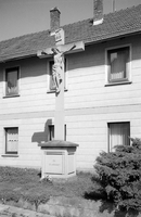 Gegenüber dem Haupteingang der katholischen Kirche in einem Vorgartenstück aufgestelltes Steinkruzifix, bezeichnet 1894. Das kubische Postament mit überstehender profilierter Platte hat auf den Flächen rechteckige Zierfelder, die aus sich überkreuzenden Rundstäben gebildet werden. Vorder- und Rückseite enthalten Inschriften. Der schlichte abgesetzte Kreuzstamm trägt eine gut durchgebildete Figur Christi, die den Gekreuzigten mit ausgemergeltem Körper darstellt. Das Hochkreuz wurde von Konrad Hahn und dessen Ehefrau Ana Kath. Theres. geb. Weber gestiftet.